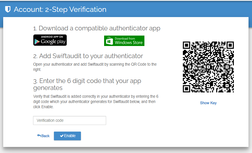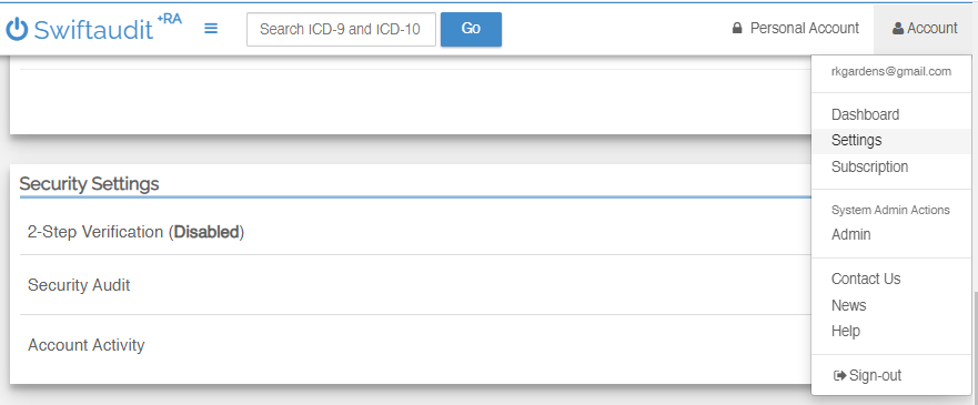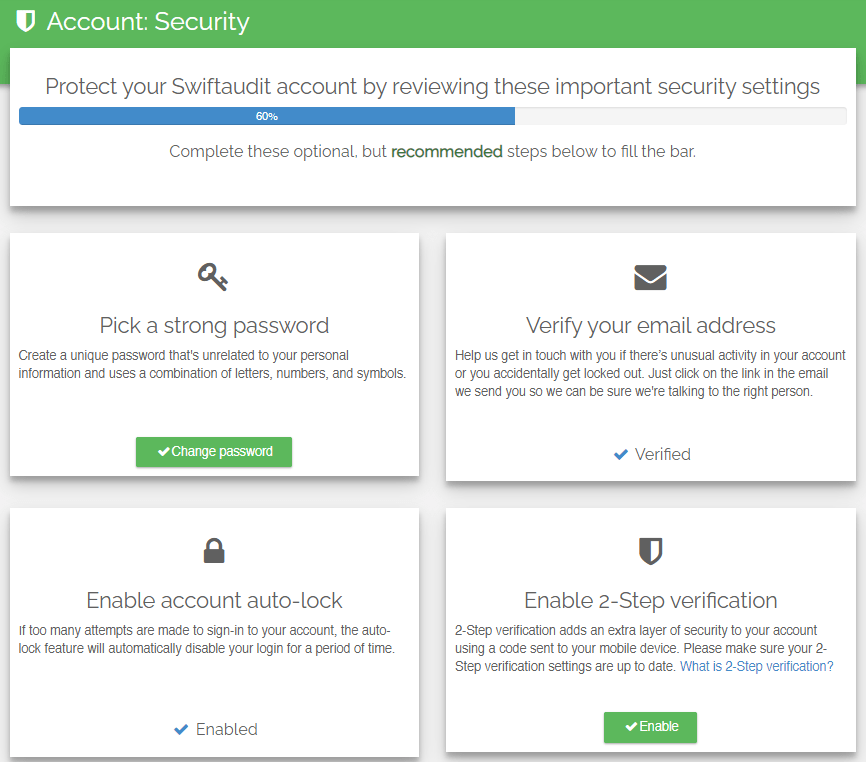 We also provide a convenient Security Audit process that allows you to review your Swiftaudit security settings at any time. You can access this audit screen from the Account -> Settings, just below the 2-Step Verification setting.